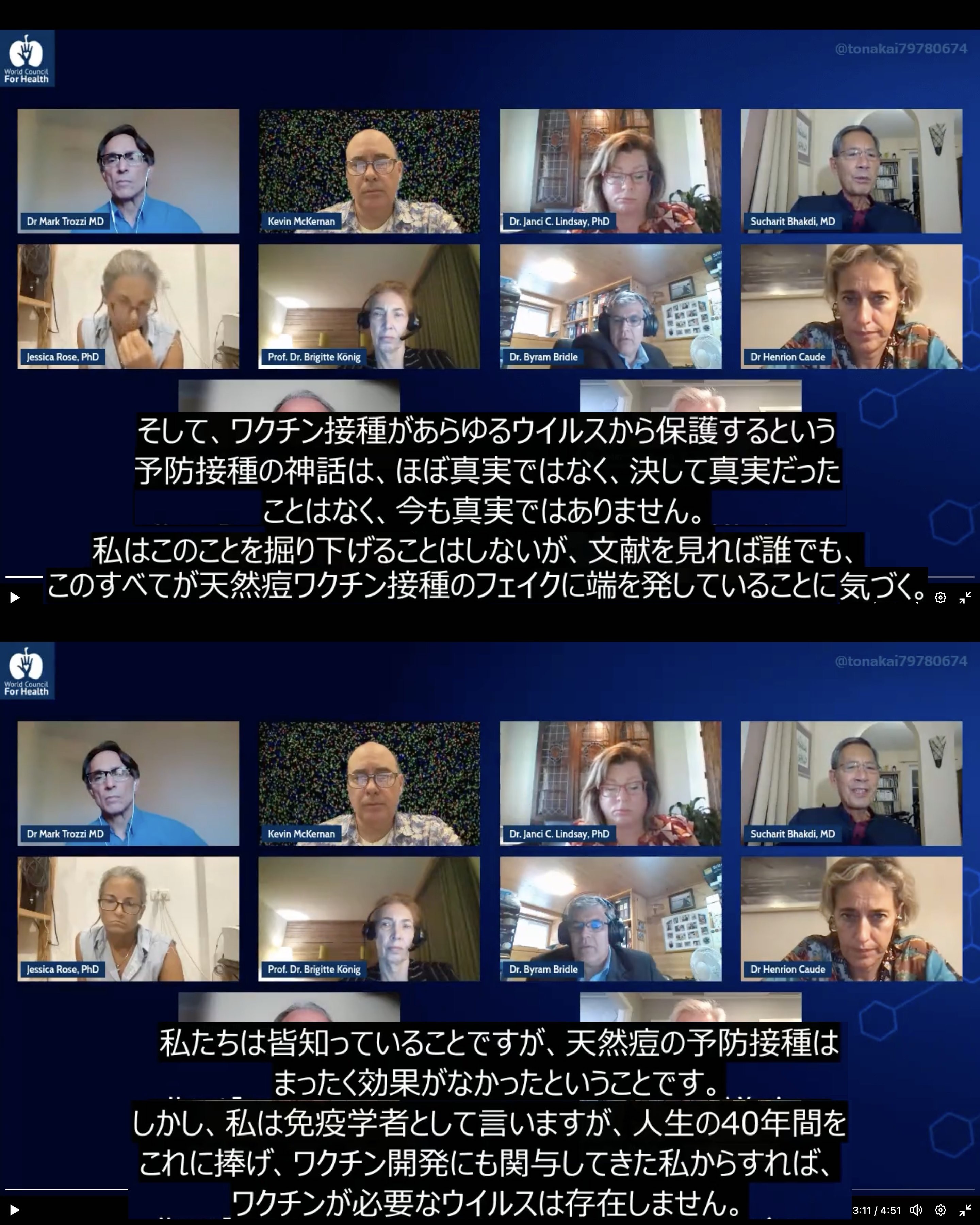 更に Bhakdi氏は全体でのディカッション中、爆弾発言をしている。Bhakdi 氏によればワクチンがウイルスから保護するという予防接種の神話は真実では無いということである。また文献を見れば天然痘ワクチン接種のフェイクが発端であり、天然痘の予防接種はまったく効果がなかったとのことである。