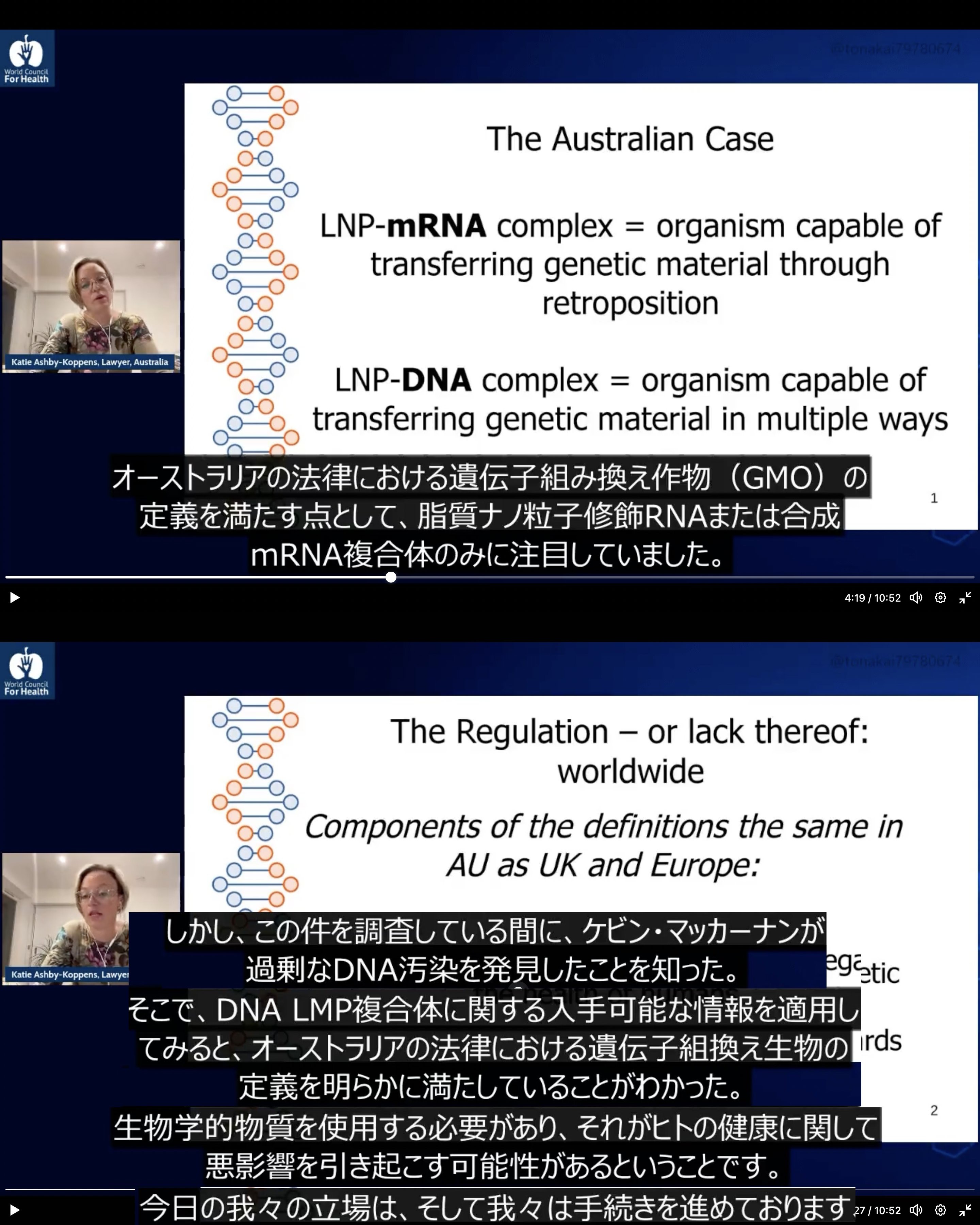 オーストラリの弁護士 Ashby-Koppens氏によると、GMO(遺伝子組換生物)要件を満たすという観点から、ワクチンの LNP-mRNA 成分に当初注目していた。しかし McKernan氏が過剰なDNA汚染をワクチンから発見したので、LNP-DNA なら更に確実に GMO 要件を満たすことが分った。また人の健康に悪影響を惹起こす可能性があると分った。モデルナとファイザーのワクチン製品が GMO 要件を満たすものとして、その観点から製品取扱いを差止める法的手続きを開始したとのことである。