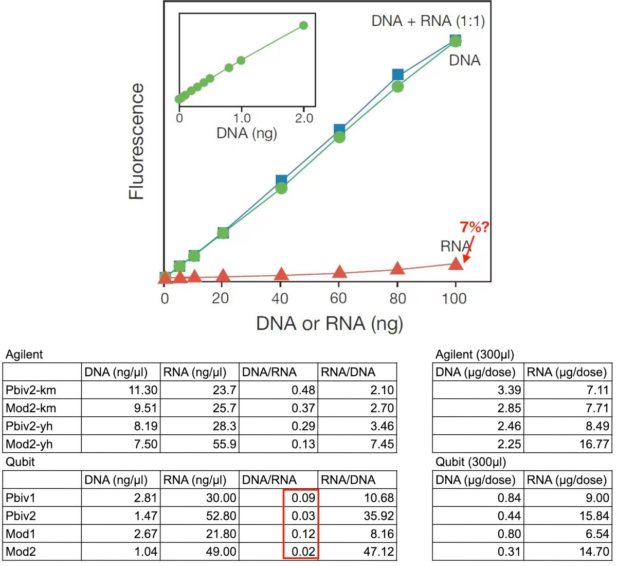グラフは、蛍光染料を使うQubitだとRNAだけでを検量してもDNAだと7%は誤認されると解釈されるメーカーのグラフである。